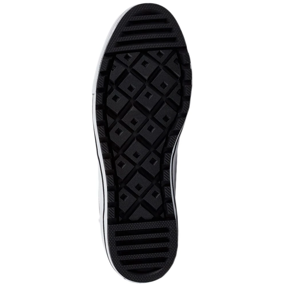 Die Kombination aus einem klassischen schwarzen Leder gepaart mit einer robusten Gummisohle lässt einen ganz neuen Sneaker-Look entstehen. Dabei hat der Ember Boot viele bekannte Converse-Features im Gepäck. Die weiße Gummisohle mit schwarzem Zierstreifen trägt am Schuhrücken das bekannte Markenpatch. Anders als bisher hat die Sohle wesentlich mehr Grip und verleiht dir damit vor allem für die kalten Monate einen festen Halt auf feuchten und rutschigen Untergründen. Der hohe Schaft trägt einen gepolsterten Kragen aus Textil. Damit genießt du einen angenehmen und wärmenden Tragekomfort. Ein 5-Loch Schnürsystem ist durch Ösen aus Metall besonders robust und verleiht dem Schuh einen derben Bootie-Look.